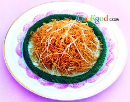 1、将红薯洗净切成0.2厘米粗的细丝,入清水中漂洗掉白色的淀粉。将洗好的红薯丝放入七成热的色拉油中,用中火炸6-7分钟至金黄色捞出控油。