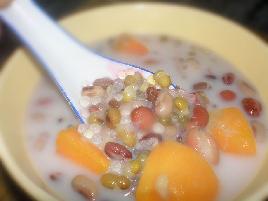 生的眉豆、红豆、绿豆、腰豆各50克、西米1包、椰浆1罐、炼奶100毫升