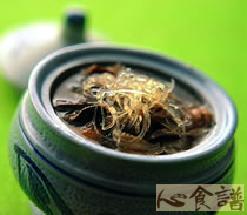 (1)将材料分别洗净,香菇切丝、芋头切块、假鱼翅用水浸泡2~3小时、鱼皮要先煮软备用。