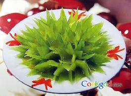 2、把泡好的笋条摆在盘子里成花形图案,上面淋柠檬汁即可上桌食用。