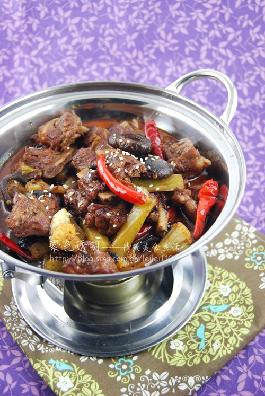 6.7.做好的红酒豆豉排骨盛到干锅中。淋上炖排骨的肉汤,可以撒上少许熟的白芝麻点缀8.点上酒精炉,把干锅座上即可上桌