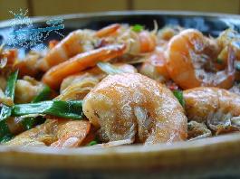 5.放入葱叶段,翻炒均匀即可。(注:虾从进锅到出锅大概是5~6分钟左右,盐要适当的少放点,咸了就不好吃了)