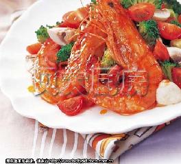 大虾色泽红润,味鲜诱人,与各种时蔬搭配使营养均衡。