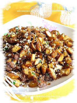 2.把腌好的肉丁下锅爆炒.下洗净的虾皮.再放香干.都炒干.