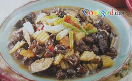 材料冬笋2个 小冬菇10朵 罐头螺肉1罐 胡萝卜1/4个约80克 红椒1根 葱1根 姜、大蒜各15克调味料A料:黄酒1大匙B料:蚝油2大匙 玉米粉水1大匙 高汤或热水1杯糖、香油各1小匙 胡椒粉1/2小匙