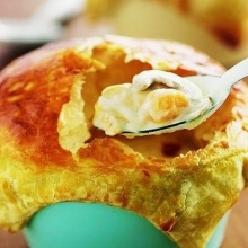 5.烤箱预热至190℃,将汤碗放入烤箱中下层烤15分钟至酥皮变为金黄色并隆起即可。