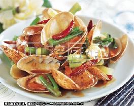 本菜中的芒果贝可以用其他贝壳来替代,文蛤、花蛤、小海螺都是不错的选择。起锅烧热油煸香葱姜、干辣椒,放入花蛤翻炒2分钟,加绍酒后加盖焖2分钟,放入芥兰片、红椒片、海鲜酱炒匀,加少许盐,即可。
