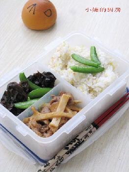 上班族自带盒饭全攻略——二米饭+竹笋炒肉+木耳甜豆
