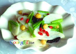 去皮淮山药300克,水发黑木耳25克,土芹段20克,发制好的白果50克,枸杞子10克。调料精盐10克,味精10克,白糖6克,湿淀粉25克,料油50克,清水2000克。