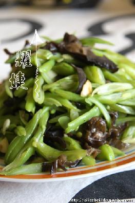 1.扁豆、木耳切丝;过开水焯一下。扁豆一定要待颜色完全变绿才可以啊!