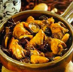 1、将鸡肉剁成块,撒盐、胡椒粉用油煎上色,放入焖锅内加香叶,适量清汤焖15―20分钟。