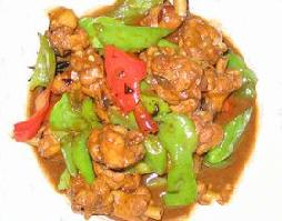 3.炒锅放旺火上,加植物油,烧至七成热时,加鸡块煸炒,八成热时放酱油、盐、料酒翻炒几下,再放入青尖椒块,翻匀出锅即成。