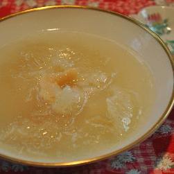 3.取一沙锅,把熬好的鸡肉汤和煮发好的鱼翅放入,用中偏小火烧开。将锅盖上,转小火烧约3小时,至鱼翅软滑即好,其间查看汤量,如果太稠,可稍加水。吃时加盐,胡椒调味。