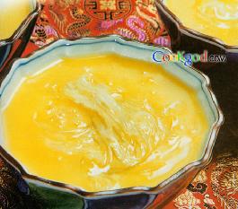 (3)起锅,放煲好浓汤1250g,加入鱼翅,放精盐5g,味精1g、鸡粉1g,烧开试味后,勾薄芡,撒胡椒粉即成。