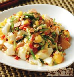 3.将作法1的蛋丁、作法2的材料与所有调味料拌匀即可。