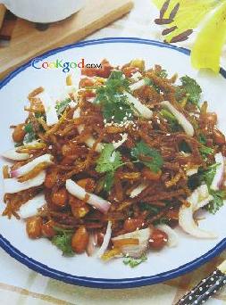 ③将炸土豆丝、葱头丝、花生米、芝麻、香菜叶加调料拌匀即可