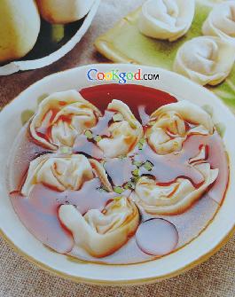 3、在抄手盘中浇上抄手汁,再淋上红油,也可撒上少许香菜末,即可食用。