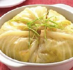 2.高丽菜切掉外叶,再从底部中间切划十字(深度约到高丽菜一半),再沖洗干净放入沸水中汆烫至表面稍软,捞出放入砂锅中备用。