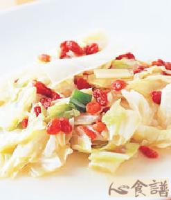 枸杞1大匙,高丽菜半斤,姜片10公克,盐1/2茶匙,糖1/4茶匙,水5大匙
