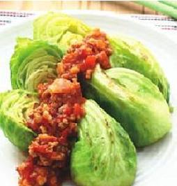 4.将作法3的高丽菜苗盛盘,淋上蕃茄肉酱即可。