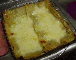 4. 在烤盘底涂一层白酱,铺一层面皮,一层肉酱,一层白酱,一些莫萨里拉(Mozzarella)奶酪,然后重复三次,最后用一层面皮盖在上面,涂一层白酱,撒上莫萨里拉奶酪。我最后奶酪剩的太少,最上面一层奶酪放的太少,烤出来不太好看。