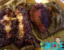 5.取2片粽叶将叶尖部分交叠折成长杓状,先填入1层紫糯米饭,再舖上1层山药泥后,放上桂圆肉,然后盖上1层紫糯米饭,再撒上枸杞