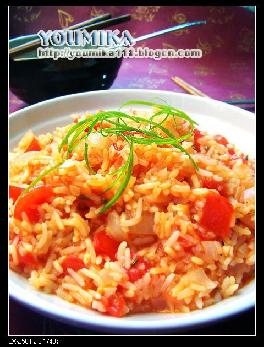 米0.5杯,番茄酱2大匙,洋葱1个,蒜头3瓣,小茴香1小匙,番茄1个,油60毫升,盐0.5小匙,沸水2杯