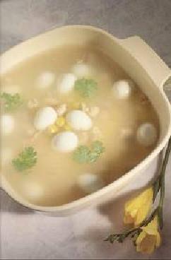 主料:鹌鹑蛋12只,鸡肉4两(约160克),粟米粒1罐,鸡蛋2只,芫荽2棵(切碎),上汤6杯。, 辅料:生粉1/2汤匙,胡椒粉少许,水1/2杯。糖1/2茶匙,麻油少许,盐适量。 芡料:粟粉3/2汤匙,水1/2杯。