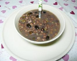 美肤杂粮粥,原料:黑豆14g,黑米14g,小米34g,绿豆34g,红豆34g,薏仁34g,糙米34g,芡实34g