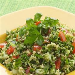 干小麦4汤匙,沸水100毫升,欧芹1大把,切碎,薄荷1小把,切碎,西红柿5个,切成丁,洋葱1个,切成细丁,初榨橄榄油2茶匙,柠檬1个,榨汁,盐适量