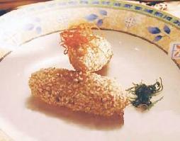 6.炒勺放油,烧至七成热,下芝麻鱼卷炸熟,呈金黄色时捞出,控净油分,整齐摆在盘内即成;