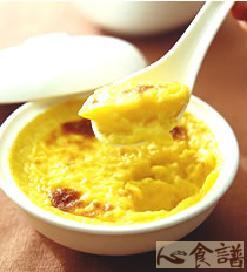 (4)把蛋打入作法(3)中,接着倒入已经煮好的西谷米,舀入小烤盅里,再放入烤箱烤至表面成金黄色即可。