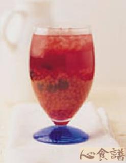 (2)把椰果放在珍珠圆上,再撒上少许碎冰,再将剩下一半的葡萄汁倒入即完成。