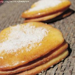 【饼干配料】黄油60g,,糖粉55g,,鸡蛋1/2只(每只大约40-50g),另余一些蛋液备用,低筋粉110g,,泡打粉1/4小勺,蜂蜜1大勺,椰丝10g,,椰丝适量(洒在饼干上),【椰丝陷配料】黄油50g,,椰丝10g,,糖粉20g,【烘焙】烤箱中层,190°上下火,共约15-20分钟