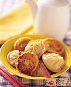 (4)将电锅预热,压下开关,内锅加入少许油,等油热后,再将小笼包一一排入锅底,略煎至底成为金黄色,并轻轻铲动一下小笼包,才不会黏锅底,然后加入1杯水,加盖煮至锅中有油爆声,打开锅盖再将开关扳起,略停一会至小笼包底部干酥,即可盛起放入盘中食用。