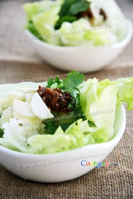 6、取一片大的生菜叶,放入蒸熟的米饭、土豆泥、各种青菜、鸡蛋酱,用生菜叶包好即可。