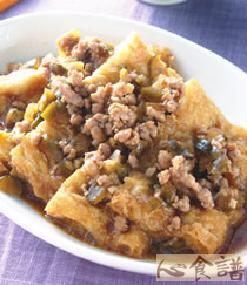 炸豆包3块,瓜仔肉燥半碗,水1杯半