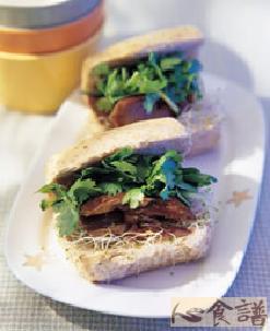 (4)依序将辣椒酱、花生粉、小黄瓜丝、苜蓿芽、焢肉、香菜等材料包入馒头刈包中即可食用。