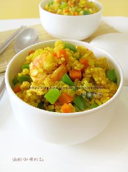 米饭,虾仁,鸡肉,青椒,胡萝卜,鸡蛋,洋葱,咖喱粉,盐,白糖