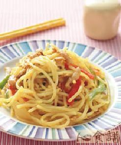 3.于作法2的原锅放入作法1的烤鸡肉条炒2分钟,加入乌龙面及所有调味料,以中火炒3分钟,加入青椒与红甜椒丝快炒2分钟即可。