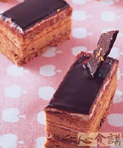 8.将作法5的蛋糕体切成三等份,在第一层抹上巧克力脆片后,再叠上一层蛋糕,表面并抹上榛果奶油霜的,接着再叠上一层蛋糕,并于表面抹上榛果奶油霜后再淋上巧克力淋酱,最后再装饰巧克力脆片即可。