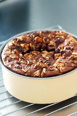 出自土屋公二《巧克力专业师傅的巧克力》,有改动。这是一个18cm圆模的量,或者用21.5cm的挞盘,烤成扁平状。我用的模子是16cm,太厚了。方子本身是一个普通的古典巧克力蛋糕(Gateau chocolat),加了栗子核桃一起烤。古典巧克力规矩是会呈中心凹陷周边高的盆地形状,但是面糊太厚,盆地得太结棍了。还有,这方子吃起来甜苦势均,糖考虑减10-20g,巧克力蛋糕,带苦才够意思。