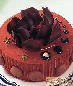 全蛋180公克,细砂糖80公克,低筋面粉35公克,杏仁粉25公克,可可粉30公克,乳化剂5公克,发酵奶油90公克,内馅:适量,夏夷果仁适量,装饰:适量,巧克力片适量,巧克力粉适量,巧克力饼干适量