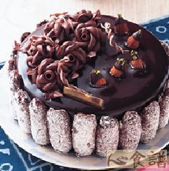 5.作法4的整体蛋糕表面,用打发之鲜奶油抹面后,放入冰箱冷冻库约20分钟,取出后再用巧克力淋酱来淋面,蛋糕侧边用洒上糖粉的手指饼干黏附,接着表面用挤花袋装入软质巧克力,挤出巧克力花并放上烤过的杏仁果装饰即可。