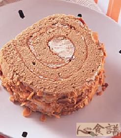 6.将蛋糕体抹上咖啡奶油霜后,,藉由桿面棍滚动烤焙纸,将蛋糕由内向外推捲成圆筒形,再静置5~10分钟定型后,表面即可抹上咖啡奶油霜,并均匀地沾上作法5后,再摆上装饰2即可。