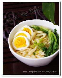 4.捞出面条后,浇入调了盐的素高汤,并码上青菜和切片的鸡蛋,撒上葱花即可。