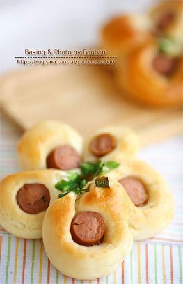 汤种:,金像粉20g20G,牛奶80g,面团:,金像粉250g,牛奶120g,干酵母4克,细砂糖30G,全部汤种,盐3g,鸡蛋25G,黄油30G,配料:,烟熏热狗肠(黑胡椒味),葱花