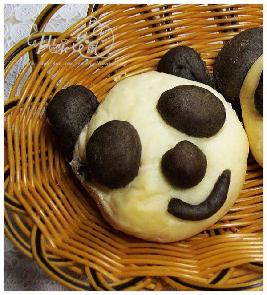 这是专门为同事女儿做的熊猫面包.白面团请参考烤肉土司配方.黑面团请参考芝麻酱土司配方先把白色面团包好红豆沙整形成小园形.再把黑面团的耳朵.鼻子.嘴分别按形状做成.