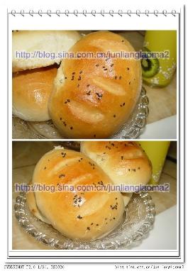 3.4、表面刷蛋液,我有三个撒了黑芝麻,你们自己看看哪个好看。呵呵!烤箱预热180度,放入烤箱烤20分钟即可。