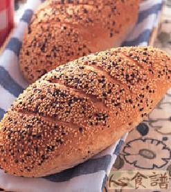 2.将松弛好的作法1以擀面棍擀开,再捲起成橄榄形,并将表面均匀沾上混合的黑、白芝麻,放入烤盘中移入发酵箱,以温度38℃、相对溼度85%进行最后发酵约40~45分钟至体积膨胀为一倍大。